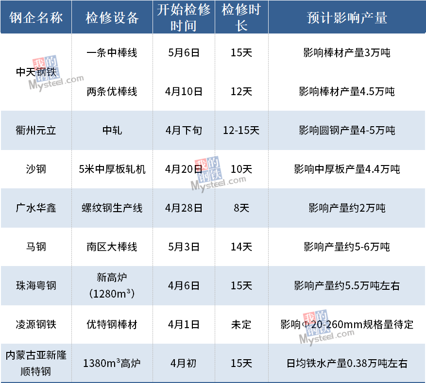 据Mysteel不完全统计,2021年4月有8家钢厂公布检修计划。其中,马钢计划于5月3日开始对南区大棒线进行检修,预计检修14天,总计影响产量约5-6万吨。其次,珠海粤钢棒材生产线计划于4月6日开始停产检修,计划为期15天,预计到4月20日复产,影响产量约5.5万吨左右。具体情况如下: