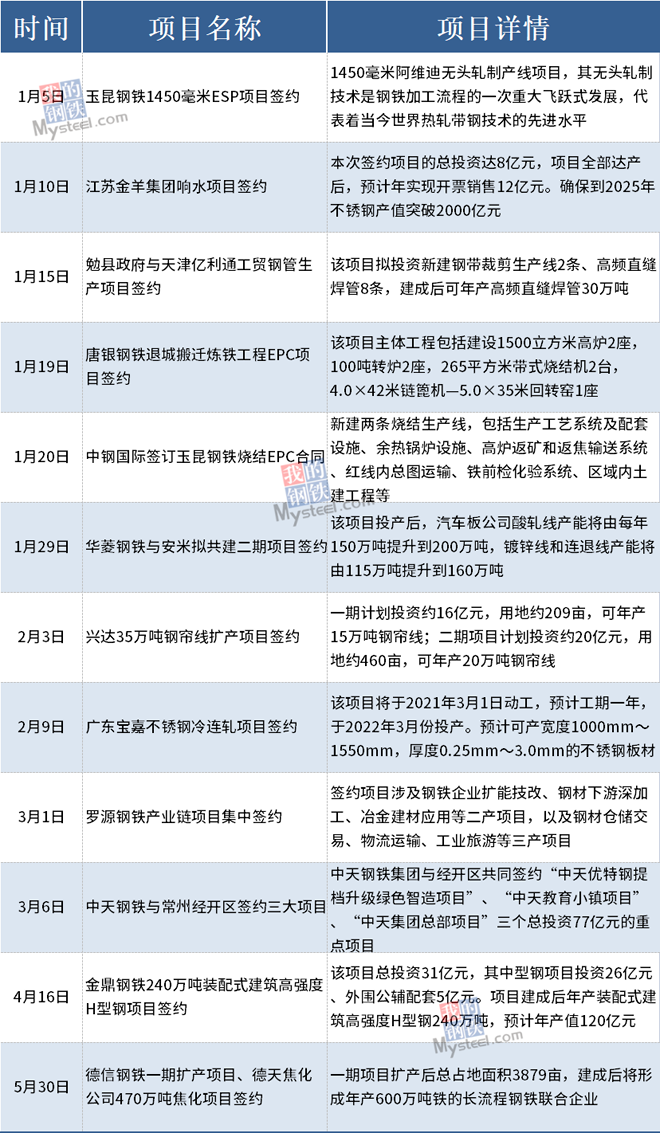据不完全统计,2021年1-5月国内12个钢铁项目签约。其中涉及,玉昆钢铁1450毫米ESP项目,唐银钢铁退城搬迁炼铁工程EPC项目,罗源钢铁产业链项目和金鼎钢铁240万吨装配式建筑高强度H型钢项目等,具体内容如下: