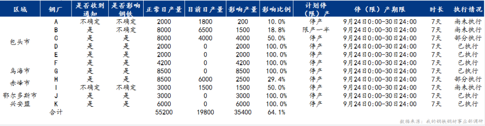 截至目前,内蒙古区域内11家样本钢厂已经有6家全部停产,占样本企业54.5%,2家钢厂部分停产,还有3家钢厂处于不确定状态。目前区域内样本钢厂日均产量19800吨,影响日均产量35400吨,限产比例已经到正常产量的64.1%,涉及建筑钢材轧线已经停产18条,占样本总数85.7%。