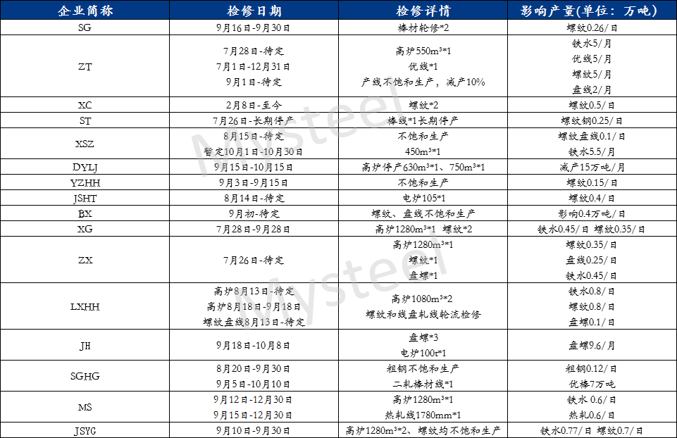 徐州JH于9月18日-10月8日全厂检修,预计影响盘螺产量9.6万吨,与此同时SG也计划9月16日-9月30日对两条棒材线轮流检修,预计影响螺纹产量约3.64万吨。