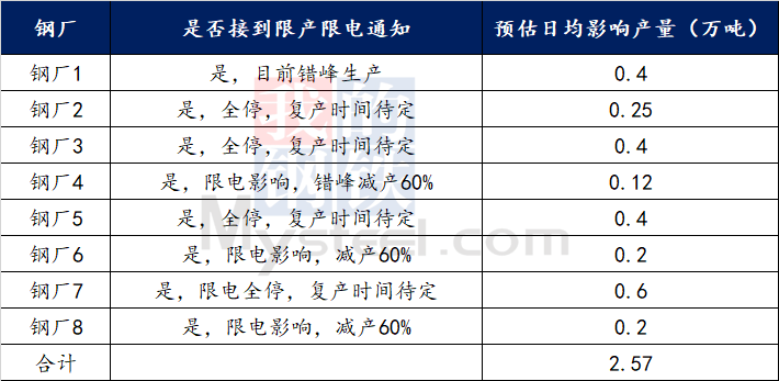 9月23日国网沈阳供电公司发布《关于9月23日辽宁省实施拉闸限电的通知》后,据Mysteel调研显示,辽宁省内14家钢铁生产企业中有8家表示已经接到限电通知并在协调减产以减少用电量、减产品种以建筑钢材为主,有3家表示已接到限电通知但对钢铁生产影响不大,另有3家表示目前尚未收到限电以及减产通知,详细影响情况我网稍后发布。