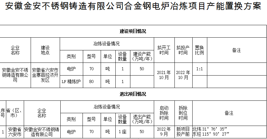 按照《国务院关于化解产能严重过剩矛盾的指导意见》《国务院关于钢铁行业化解过剩产能实现脱困发展的意见》和《钢铁行业产能置换实施办法》要求,现将安徽金安不锈钢铸造有限公司合金钢电炉冶炼项目产能置换方案予以公告,欢迎社会公众进行监督。