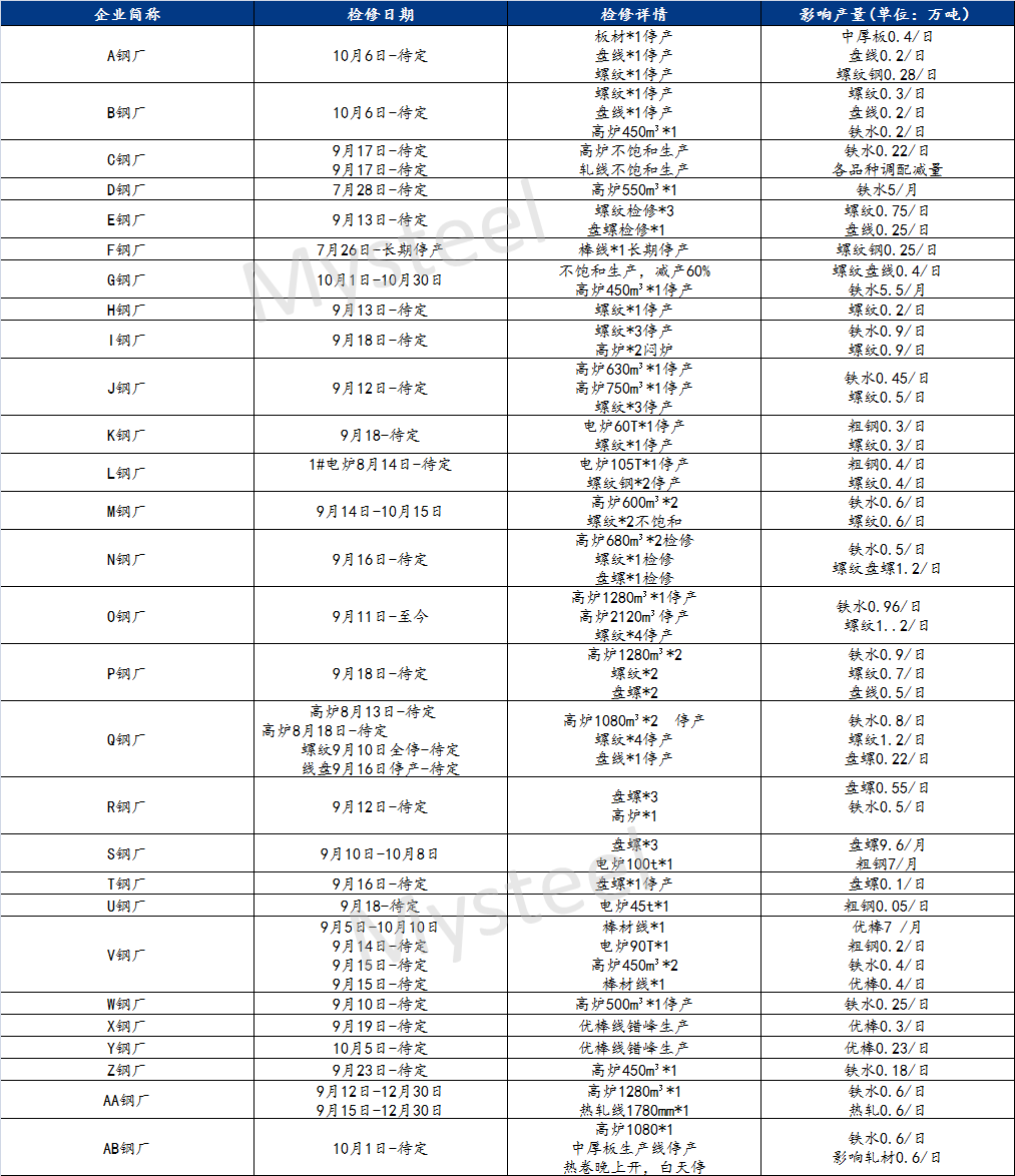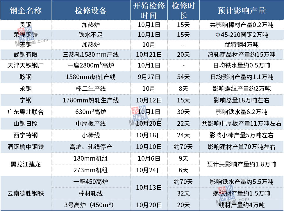 据Mysteel不完全统计,截至10月8日,全国有14家钢厂发布10月检修计划,其中,酒钢榆中钢铁拟定于10月10日-12月下半旬对高炉、轧线停产,预计影响建材产量70万吨左右;其次,云南德胜钢铁计划于10月13日开始对厂内一座450高炉进行停产检修,计划停产检修到年底,10月13日-20日对厂内棒材轧线检修,10月20日-11月22日对厂内线材轧线检修,预计影响铁水产量约5.5万吨,螺纹钢产量约1.5万吨,线材产量约4万吨。