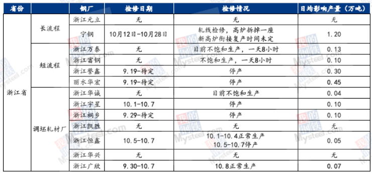 据Mysteel调研,截至10月7日,浙江省内部分钢厂在国庆期间陆续恢复生产,但仍处于不饱和生产状态,整体产量环比上周小幅增加,总计日均影响产量2.54万吨左右。