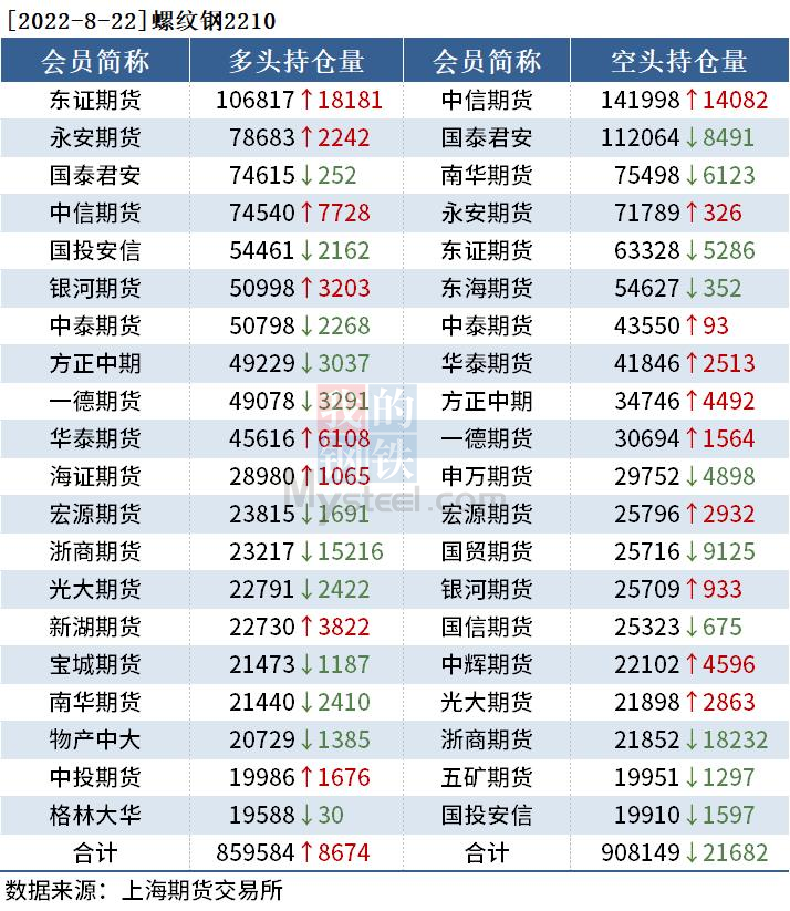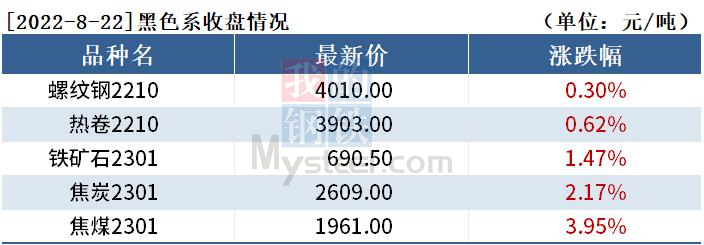 截至8月22日收盘,螺纹钢2210收4010元/吨,涨0.3%;热卷2210收3903元/吨,涨0.62%;铁矿石2301收690.5元/吨,涨1.47%。