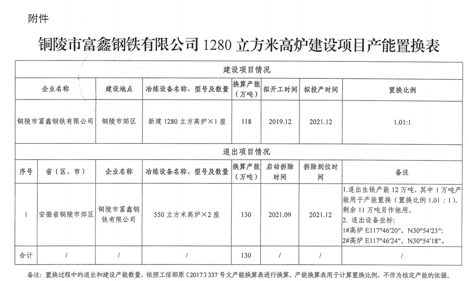 按照《国务院关于化解产能严重过剩矛盾的指导意见》《国务院关于钢铁行业化解过剩产能实现脱困发展的意见》和《钢铁行业产能置换实施办法》要求,现将铜陵市富鑫钢铁有限公司1280立方米高炉建设项目产能置换方案予以公告,欢迎社会公众进行监督。