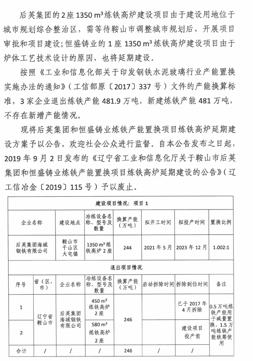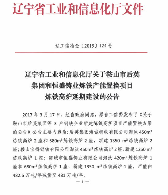 近日,辽宁工信厅发布关于鞍山市后英集团和恒盛铸业炼铁产能置换项目炼铁 高炉 延期建设的公告,具体如下: