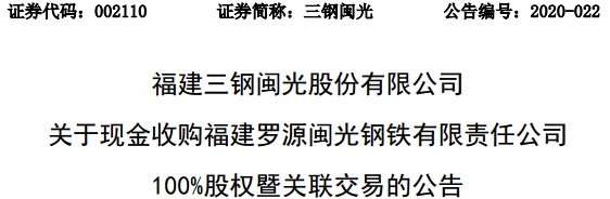 6月2日,三钢闽光发布公告表示,该公司和三钢集团、罗源闽光于福建省三明市签订了附生效条件的《福建罗源闽光钢铁有限责任公司股权转让协议》(以下简称《股权转让协议》),三钢闽光拟以自有资金21.52亿元收购三钢集团持有的罗源闽光100%股权。