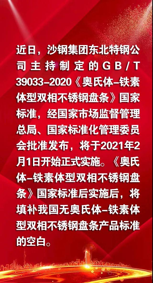 我公司于2015年成功生产奥氏体-铁素体型双相不锈钢盘条产品,随后提出了制定《奥氏体-铁素体型双相不锈钢盘条》国家标准的立项申请。2017年,国家标准化技术委员会批准由我公司牵头制定《奥氏体-铁素体型双相不锈钢盘条》国家标准。2018年,我公司主持完成了标准的征求意见和标准讨论会。2019年8月,标准正式通过由钢标委组织的专家审定,并于2019年9月正式提交了标准的报批稿,上报国标委报批。