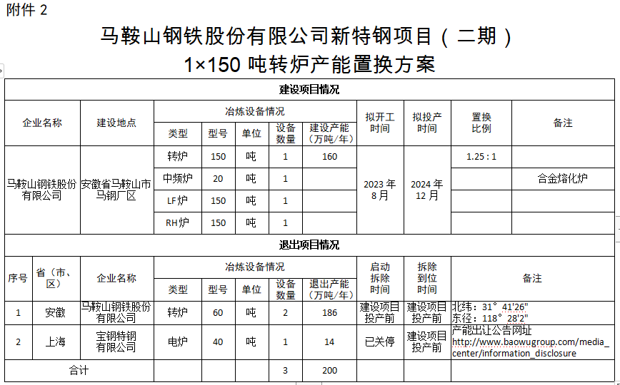 按照《国务院关于化解产能严重过剩矛盾的指导意见》《国务院关于钢铁行业化解过剩产能实现脱困发展的意见》和《钢铁行业产能置换实施办法》要求,现将马鞍山钢铁股份有限公司新特钢项目2×150吨转炉产能置换方案予以公告;同时,将我厅2018年9月6日《关于马钢(集团)控股有限公司产能置换方案的公告》中部分内容(马鞍山钢铁股份有限公司2×100吨电弧炉产能置换方案)予以废止。欢迎社会公众进行监督。