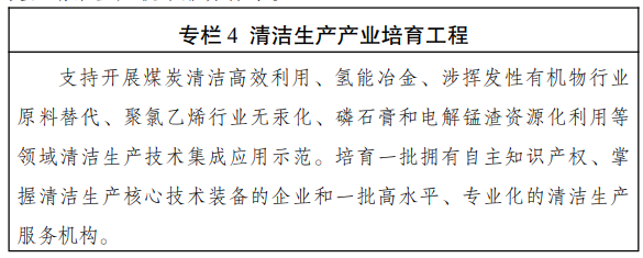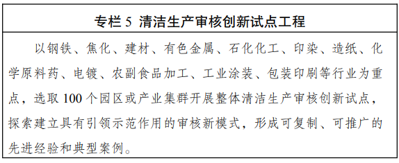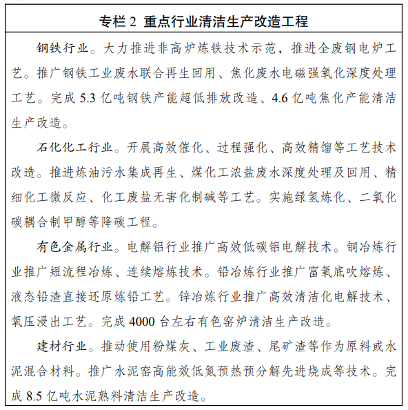 (六)大力推进重点行业清洁低碳改造。严格执行质量、环保、能耗、安全等法律法规标准,加快淘汰落后产能。全面开展清洁生产审核和评价认证,推动能源、钢铁、焦化、建材、有色金属、石化化工、印染、造纸、化学原料药、电镀、农副食品加工、工业涂装、包装印刷等重点行业“一行一策”绿色转型升级,加快存量企业及园区实施节能、节水、节材、减污、降碳等系统性清洁生产改造。在国家统一规划的前提下,支持有条件的重点行业二氧化碳排放率先达峰。在钢铁、焦化、建材、有色金属、石化化工等行业选择100家企业实施清洁生产改造工程建设,推动一批重点企业达到国际清洁生产领先水平。