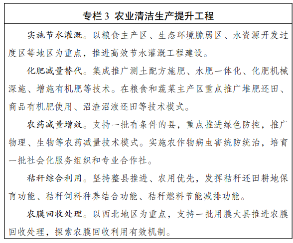 (八)提升农业生产过程清洁化水平。改进农业生产技术,形成高效、清洁的农业生产模式。严格灌溉取水计划管理,大力发展旱作农业,全面推广节水技术,不断提高农业用水效率。深化测土配方施肥,推广水稻侧深施肥等高效施肥方式。全面推广健康养殖技术,推动兽用抗菌药使用减量。加快构建种植业、畜禽养殖业、水产养殖业清洁生产技术体系,大力推广种养加一体化发展模式。