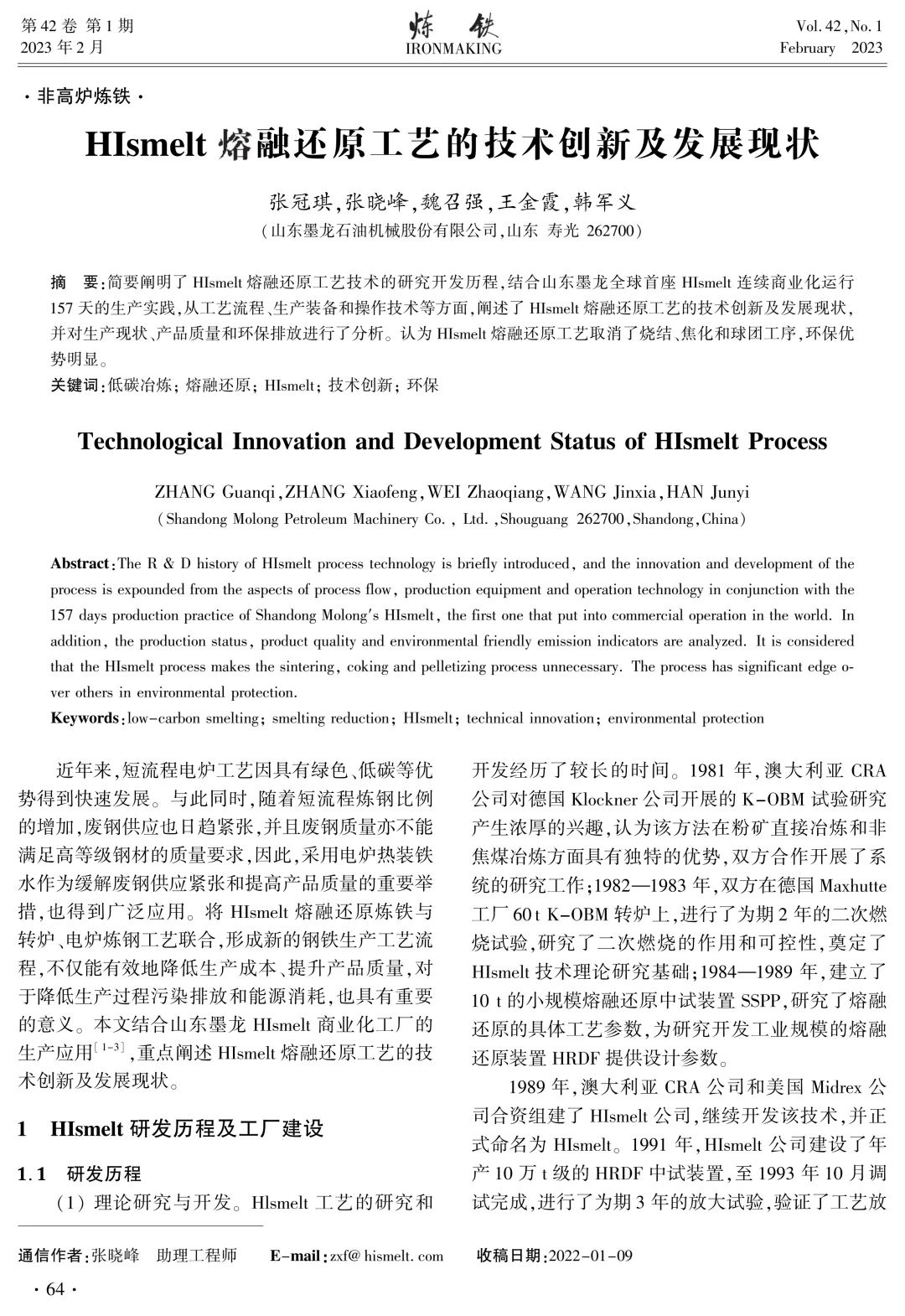 HIsmelt 熔融还原工艺的技术创新及发展现状 张冠琪,张晓峰,魏召强,王金霞,韩军义 (山东墨龙石油机械股份有限公司,山东 寿光 262700) 摘 要:简要阐明了HIsmelt熔融还原工艺技术的研究开发历程,结合山东墨龙全球首座HIsmelt连续商业化运行157天的生产实践,从工艺流程、生产装备和操作技术等方面,阐述了HIsmelt熔融还原工艺的技术创新及发展现状,并对生产现状、产品质量和环保排放进行了分析。认为HIsmelt熔融还原工艺取消了烧结、焦化和球团工序,环保优势明显。