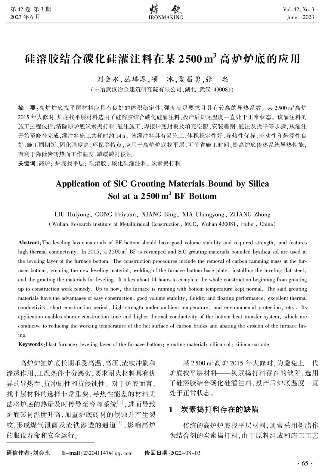 关键词:高炉;炉底找平层;硅溶胶;碳化硅灌注料;炭素捣打料
