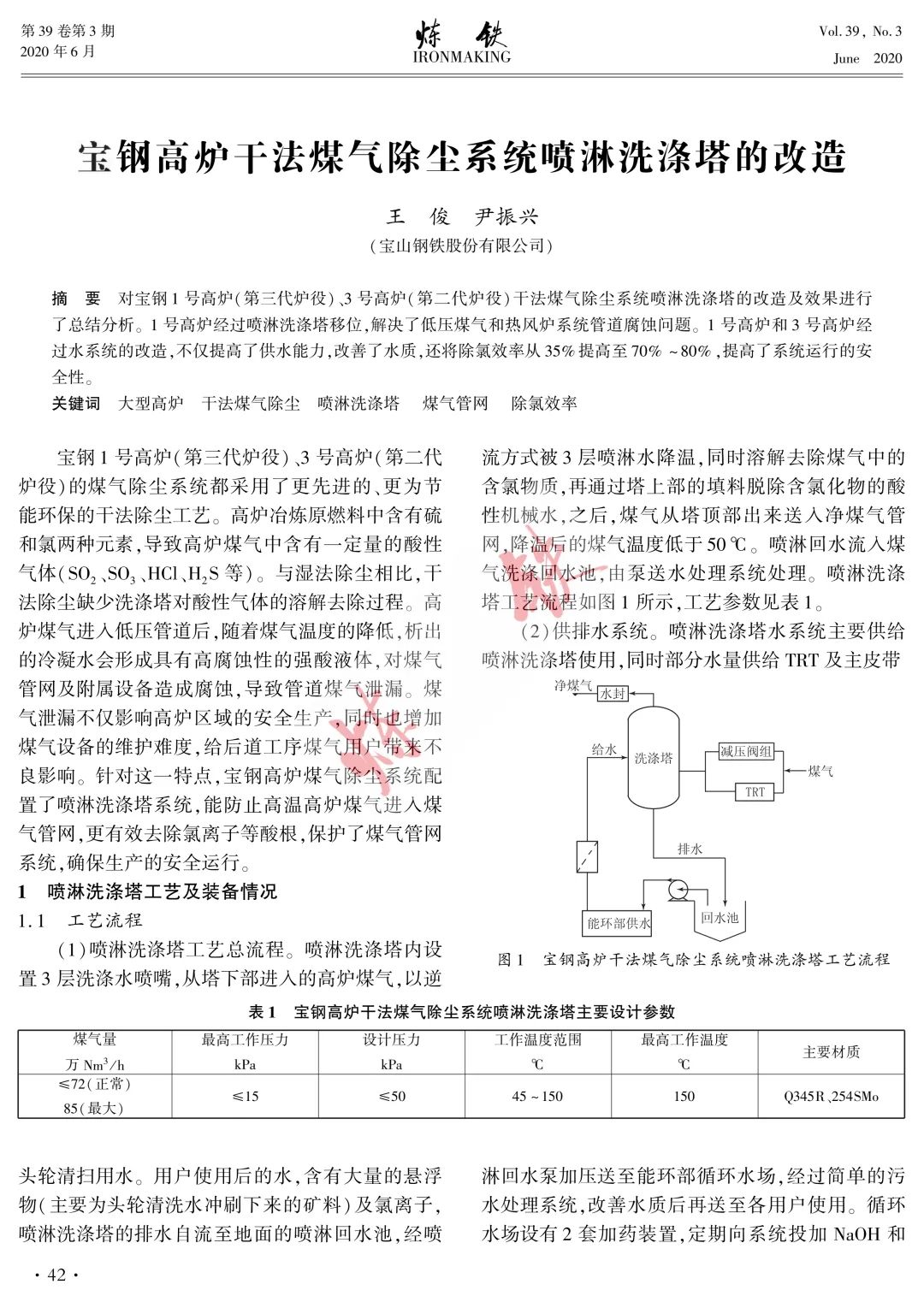 宝钢高炉干法煤气除尘系统喷淋洗涤塔的改造 王 俊 尹振兴 (宝山钢铁股份有限公司) 摘 要 对宝钢1 号高炉(第三代炉役)、3 号高炉(第二代炉役)干法煤气除尘系统喷淋洗涤塔的改造及效果进行了总结分析。1 号高炉经过喷淋洗涤塔移位,解决了低压煤气和热风炉系统管道腐蚀问题。1 号高炉和3 号高炉经过水系统的改造,不仅提高了供水能力,改善了水质,还将除氯效率从35%提高至70% ~80%,提高了系统运行的安全性。