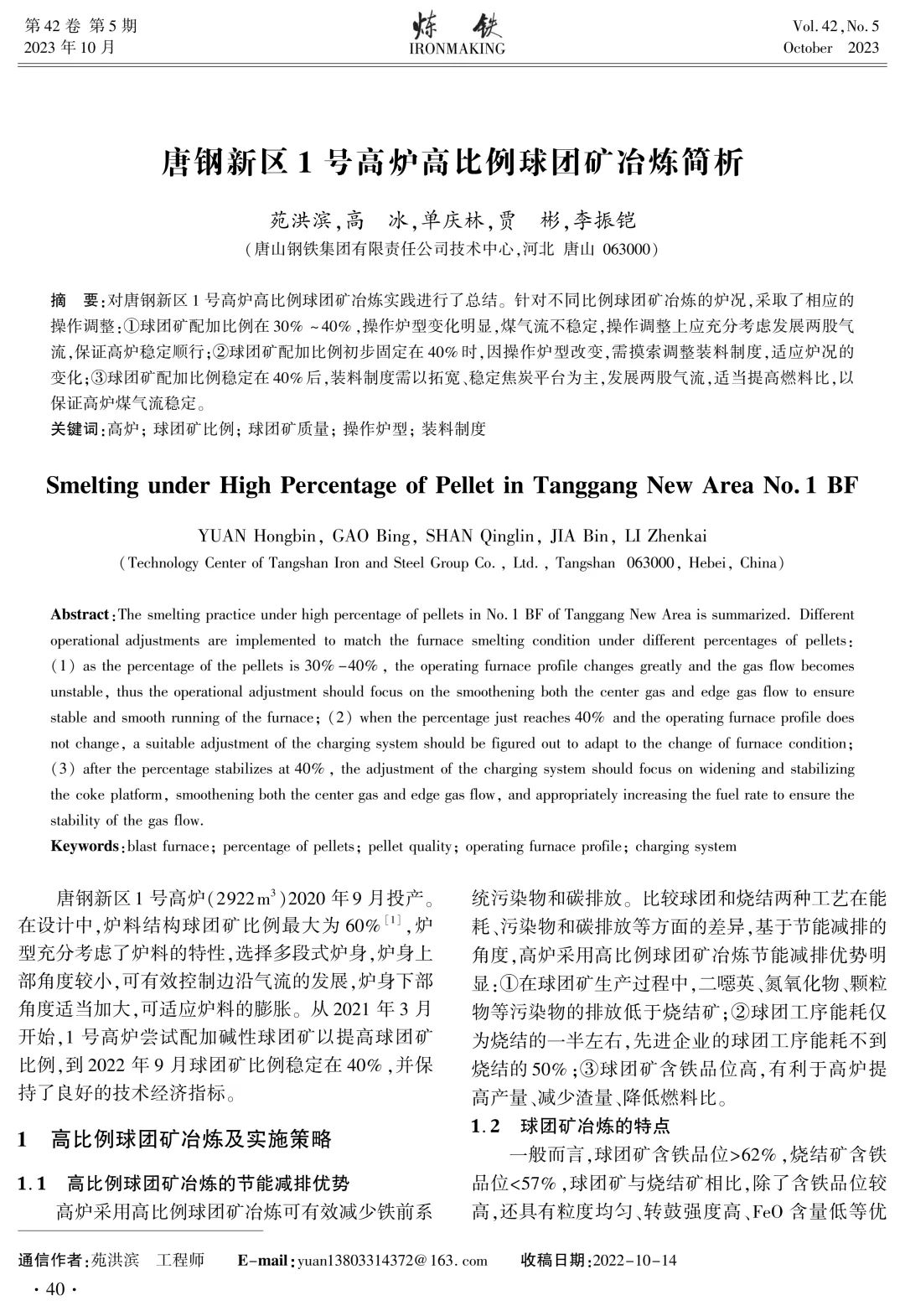 唐钢新区1号高炉高比例球团矿冶炼简析 苑洪滨,高 冰,单庆林,贾 彬,李振铠 (唐山钢铁集团有限责任公司技术中心,河北 唐山 063000) 摘 要:对唐钢新区1号高炉高比例球团矿冶炼实践进行了总结。针对不同比例球团矿冶炼的炉况,采取了相应的操作调整:①球团矿配加比例在30%~40%,操作炉型变化明显,煤气流不稳定,操作调整上应充分考虑发展两股气流,保证高炉稳定顺行;②球团矿配加比例初步固定在40%时,因操作炉型改变,需摸索调整装料制度,适应炉况的变化;③球团矿配加比例稳定在40%后,装料制度需以拓宽、稳定焦炭平台为主,发展两股气流,适当提高燃料比,以保证高炉煤气流稳定。