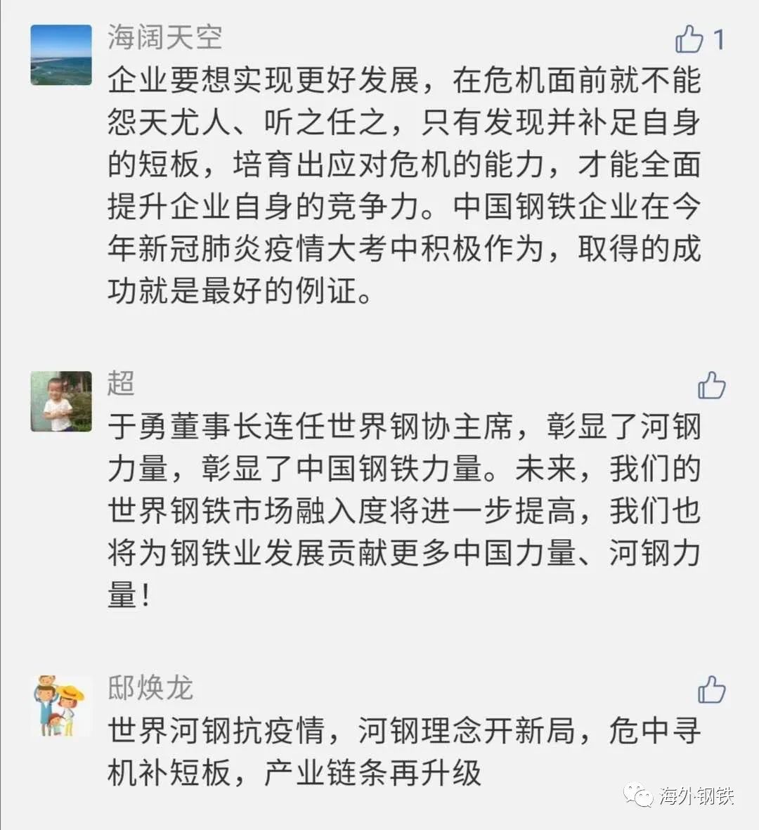 北京时间6月1日,世界钢铁协会执行委员会第65次会议以视频形式召开。会上,世界钢铁协会执行委员会委员对相关议题进行了讨论,并一致同意,根据工作需要,世界钢铁协会现任主席于勇将连任一届。(据了解,2018年10月17日,在世界钢铁协会理事会上,中国钢铁工业协会会长、河钢集团党委书记、董事长于勇当选世界钢铁协会新一届领导人,根据世界钢铁协会章程,副会长任期为2018年10月至2019年10月。副会长任期结束后,2019年10月至2020年10月将担任世界钢铁协会新一届会长;在会长任期结束后,还将再担任为期一年的副会长职务(即2020年10月至2021年10月)) 世界钢铁协会主席、河钢集团董事长于勇主持会议,来自宝武集团、韩国浦项钢铁集团、纽柯钢铁公司、巴西盖尔道集团、京德勒西南钢铁有限公司、JFE钢铁株式会社、谢韦尔钢铁公司、塔塔钢铁有限公司、德兴集团、日本制铁等全球著名钢铁企业的董事长(CEO),作为执委会委员参加会议;美国钢铁公司、奥钢联、克拉克鲁钢铁公司、沙特钢铁公司等企业董事长(CEO)作为嘉宾参加会议;世界钢铁协会总干事埃德温·巴松介绍了世界钢铁协会最新的行业安全生产报告等内容。 会议审议通过了2019年10月在墨西哥蒙特雷举行的世界钢铁协会执行委员会会议上提出的议题,并对G20全球钢铁论坛、世界钢铁短期需求预测、欧盟提出的可持续融资分类法、世界汽车用钢联盟工作汇报、“负责任的钢铁”进展、国际能源署的未来钢铁减排路线报告等议题进行了讨论。 在讨论世界钢铁协会的短期需求预测和新冠疫情对经济造成的影响时,于勇结合中国钢铁企业在应对新冠疫情中取得的成效表示: 就中国而言,新冠疫情对钢铁行业的影响要小于对整个社会经济的影响,在中国疫情最为严重的时期,钢铁企业并没有停产,仅仅降低了生产强度,整个钢铁行业体现出了较强的韧性。 一方面,中国钢铁产品90%都是用来满足内需,中国政府为应对疫情对经济的冲击出台了一系列政策,有力地拉动了相关产品需求,为钢铁行业恢复正常运营提供了较好的外部条件。 另一方面,中国钢铁企业在面对疫情冲击时也作出了积极的应对举措,例如宝武集团旗下的武钢,地处武汉这个中国疫情最严重的地区,通过积极有效的应对手段,疫情得到控制后生产经营实现了快速恢复,体现了强大的恢复能力。 应当理性辩证地看待新冠疫情对钢铁行业带来的影响,将其作为查找并补足自身短板的契机,进一步提升企业竞争力。此次新冠疫情虽然对企业发展带来了巨大冲击,但是不能将困境全部归结为疫情影响带来的,而是要审视自身在供应链、产业链等方面的短板和不足,并加以改进提升。在企业发展中不可避免要面对各种风险,我们不知道下一次的风险会是什么、会在什么时候发生。因此,要实现更好发展,就要在危机中发现并补足自身的短板,培育出应对危机的能力,全面提升企业自身的竞争力。