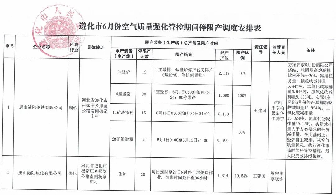 根据最新气象预测,6月6日至9日唐山市将迎来一轮大气重污染过程,为科学应对重污染过程,唐山市生态环境局迅速行动,于6月6日上午召开了应对污染过程调度会,要求针对此轮重污染过程,在执行6月份管控措施的基础上,从6日17时至9日12时,对全市钢铁、焦化、工业窑炉等行业采取加严减排措施,对涉VOCs企业和重型车进行加严管控。 会议强调,钢铁企业绩效评价为A、B级的不强制减排,鼓励自主减排。其他钢铁企业通过增加煤气回收量、严格落实煤气点燃放散,增加减排比例,最大限度发挥治污设施能力和调整烧结工序原燃料结构等方式进一步减少三项气态污染物排放。焦化企业通过延长结焦时间、优化操作水平、加强治污设施运行三个方面减少污染物排放。砖瓦窑、独立轧钢加热炉停止进新坯,涉烘干工序水泥粉磨、矿渣微粉企业停产。除连续生产的化工、焦化企业外,其他所有涉VOCs工序全部停产;加强连续性生产化工企业的燃烧治理设施的监管,确保正常运行,停用涉及UV光解治理设施。路南区、路北区、开平区、高新区立即组织对涉漆企业进行排查,各种漆料桶必须封盖储存,严防无组织排放,持续加大洒水喷淋频次。唐山京唐港、曹妃甸港加强重型柴油货车管控,除运输保障安全生产外,其余车辆严禁进出港区。 近日,河北省唐山市丰南、遵化、迁西、滦南陆续出台《6月份空气质量强化管控期间停限产调度安排表》,涉及瑞丰、东华、凯恒、经安、港陆、建龙、津西、华西、唐山特种钢等9家钢企,具体明细如下: