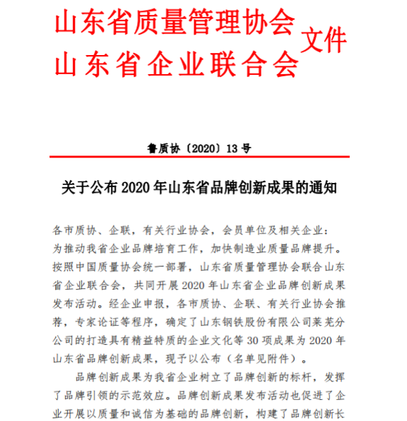 本网讯:8月25日报道由中国质量协会统一部署,山东省质量管理协会联合山东省企业联合会,共同开展的2020年山东省企业品牌创新成果于8月20日发布。 经企业申报,各市质协、企联、有关行业协会推荐,专家论证等程序,全省确定了30项成果为2020年山东省品牌创新成果,我公司“无缝钢管向“智造”转型的战略实践”品牌创新成果荣获产品创新类山东省企业品牌创新成果。 据悉,2017年新上的“高端合金管材智能制造项目”,率先引领行业推进新旧动能转换,实现了国际前沿技术的引进、消化、吸收和创新,实现了公司在行业智能制造前沿领域的率先突破,在“智造”转型活动中,公司积极发挥科技创新的作用,近两年来申请知识产权项目40项次,已授权25项次,完成科技成果评价两项次。 公司以此次品牌创新成果为契机,将积极开展以质量和诚信为基础的品牌创新,构建了品牌创新长效机制,为公司产品扩大品牌的社会影响力,提升企业品牌知名度、美誉度。