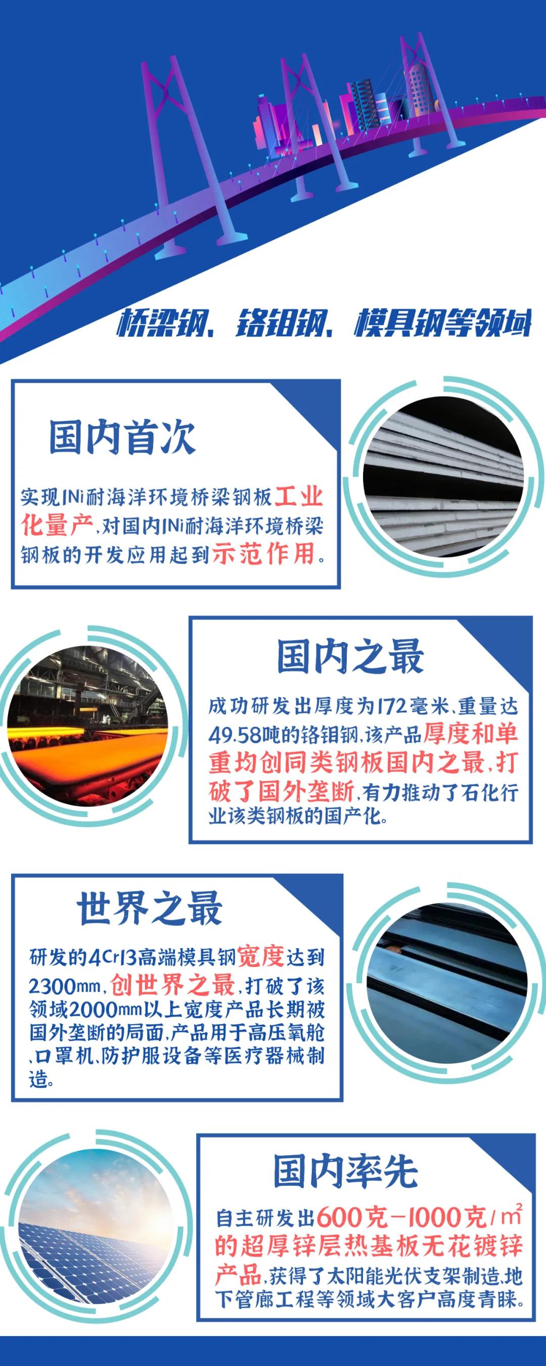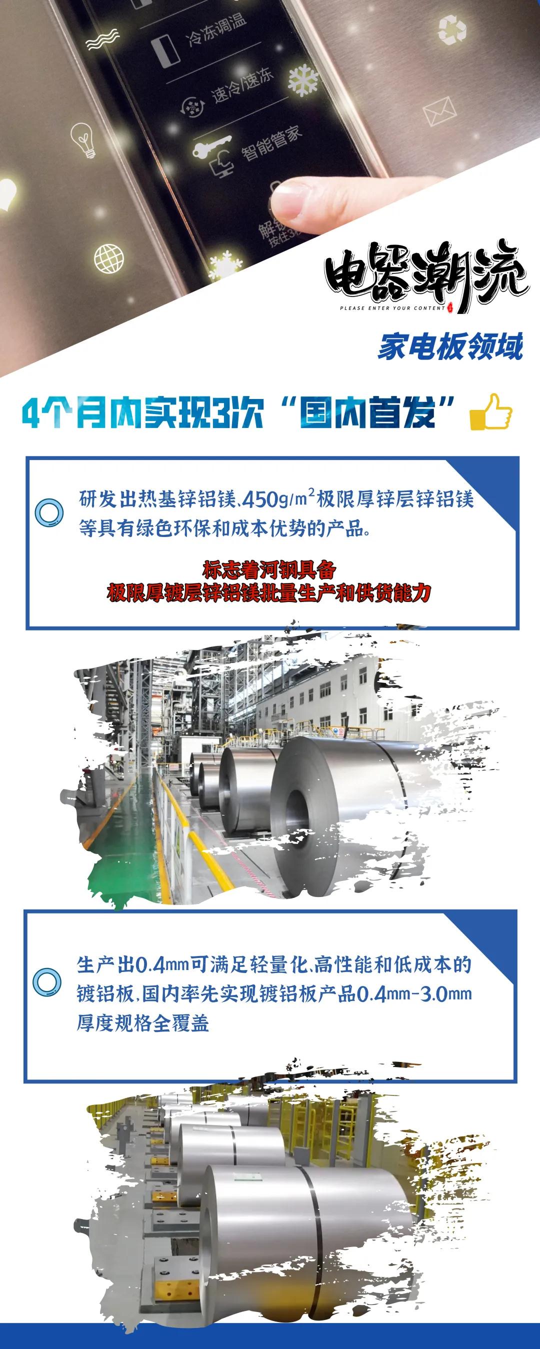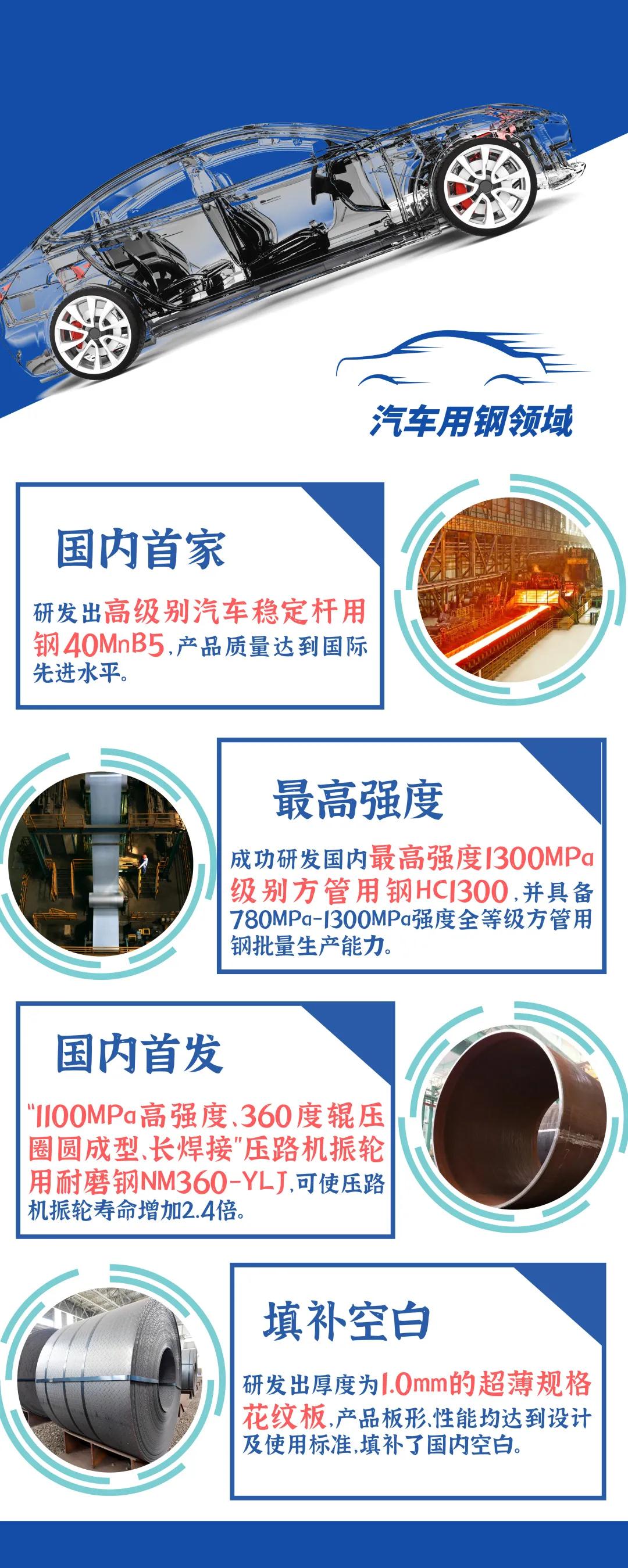 8月12日,河钢自主研发的每平方米600克至1000克的超厚锌层热基板无花镀锌产品顺利下线,填补了国内市场空白。 今年以来,河钢深入推进“两个结构”再优化,加大行业第一、唯一和替代进口产品研发创新力度,开发的世界最宽模具钢4Cr13、世界最高时速重轨、国内最高强度方管用钢HC1300等10余个产品填补了国内空白,在汽车用钢、家电板、桥梁钢、铬钼钢等细分领域打造出更多“单打冠军”。 产品的高度决定企业的高度。河钢持续聚焦“市场”和“产品”,以高端客户需求和产业链高质量发展趋势为导向,推动产品升级,打造河钢产品品牌。 着眼未来,持续加大对技术创新的重视程度和投入力度,充分发挥与国内外高端科研机构和国际一流企业合作共建的协同创新平台作用,建立跨界材料方案研发机制,进一步推动技术创新,为产品升级提供技术支撑。建立内外部资源协同创新机制,加大技术攻关、创新平台建设、高层次人才引进与培养等工作力度,不断完善技术创新体系,提升产品创新能力。 汽车用钢领域