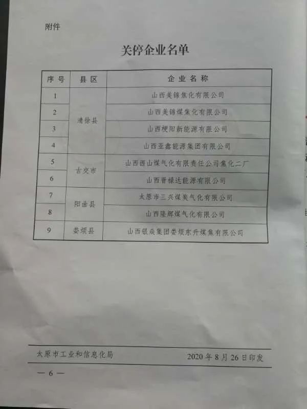 太原市工信局和生态环境局日前联合发文要求按期完成焦化产能压减淘汰任务。2020年10月31日前,关停全市炭化室高度4.3米及清洁型热回收焦炉。要在保证安全、稳定的前提下,鼓励企业提前动手,尽早关停。 通知要求,2020年10月底前,三县一市所有炭化室高度4.3米及清洁型热回收焦炉全部停产封炉;所有产生烟(粉)尘、二氧化硫、氮氧化物的生产工序全部停工停产;所有可能造成颗粒物、VOCs污染的原辅材料全部入仓入库或加盖密封;各类固态、半固态和液态废物(含一般工业固废和危险废物)全部按环保要求清运、处理或按要求推荐(贮存);不得新产生各类大气、水、固体废物等污染物。 根据关停企业名单,清徐4家,古交2家,阳曲2家,娄烦1家。