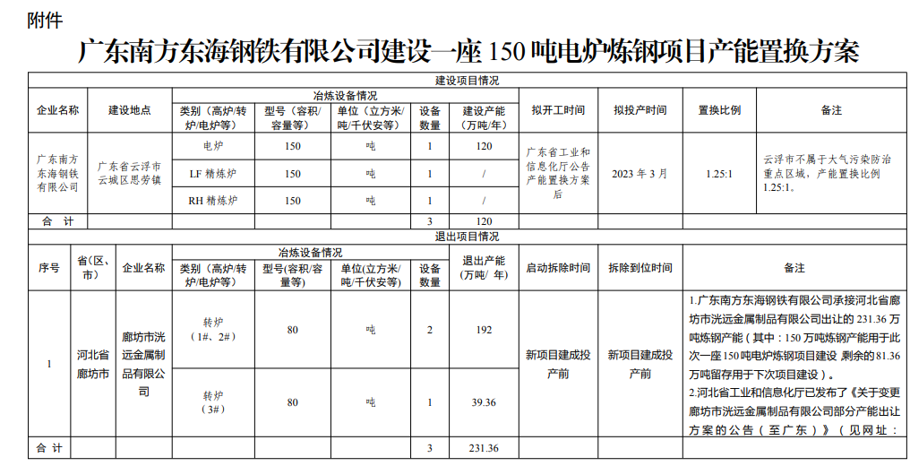 广东南方东海钢铁建设一座150吨电炉炼钢项目产能置换方案公告