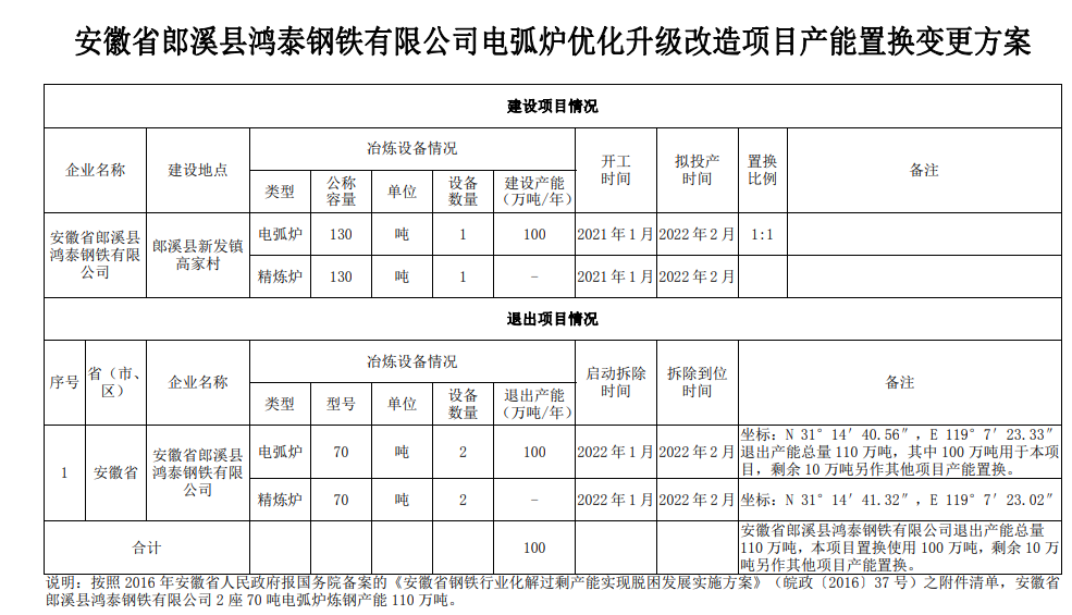 关于安徽省郎溪县鸿泰钢铁电弧炉优化升级改造项目产能置换变更方案的公告
