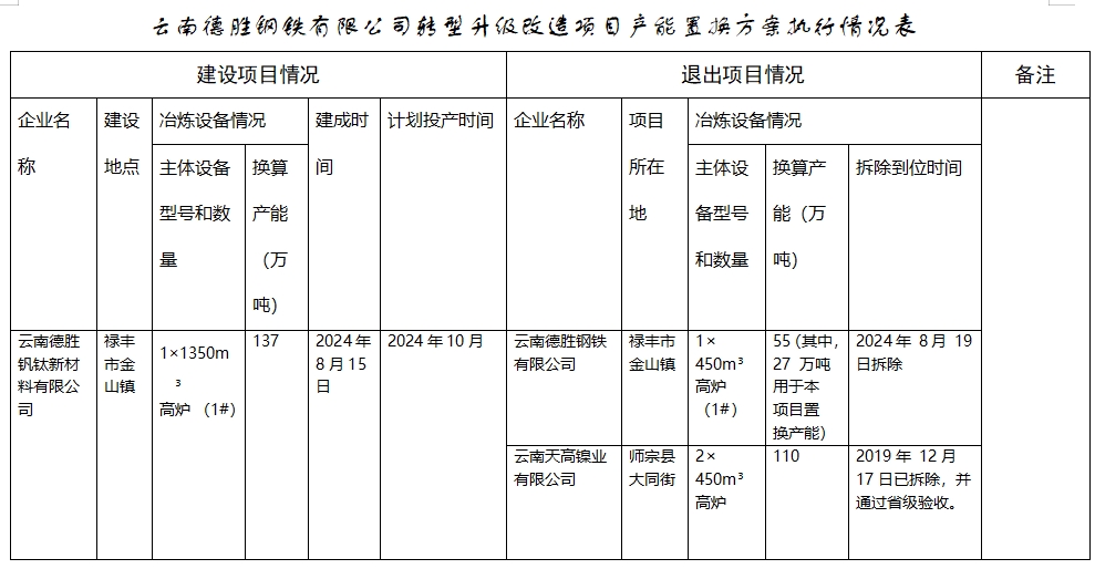 云南德胜钢铁转型升级改造项目产能置换方案执行情况公示