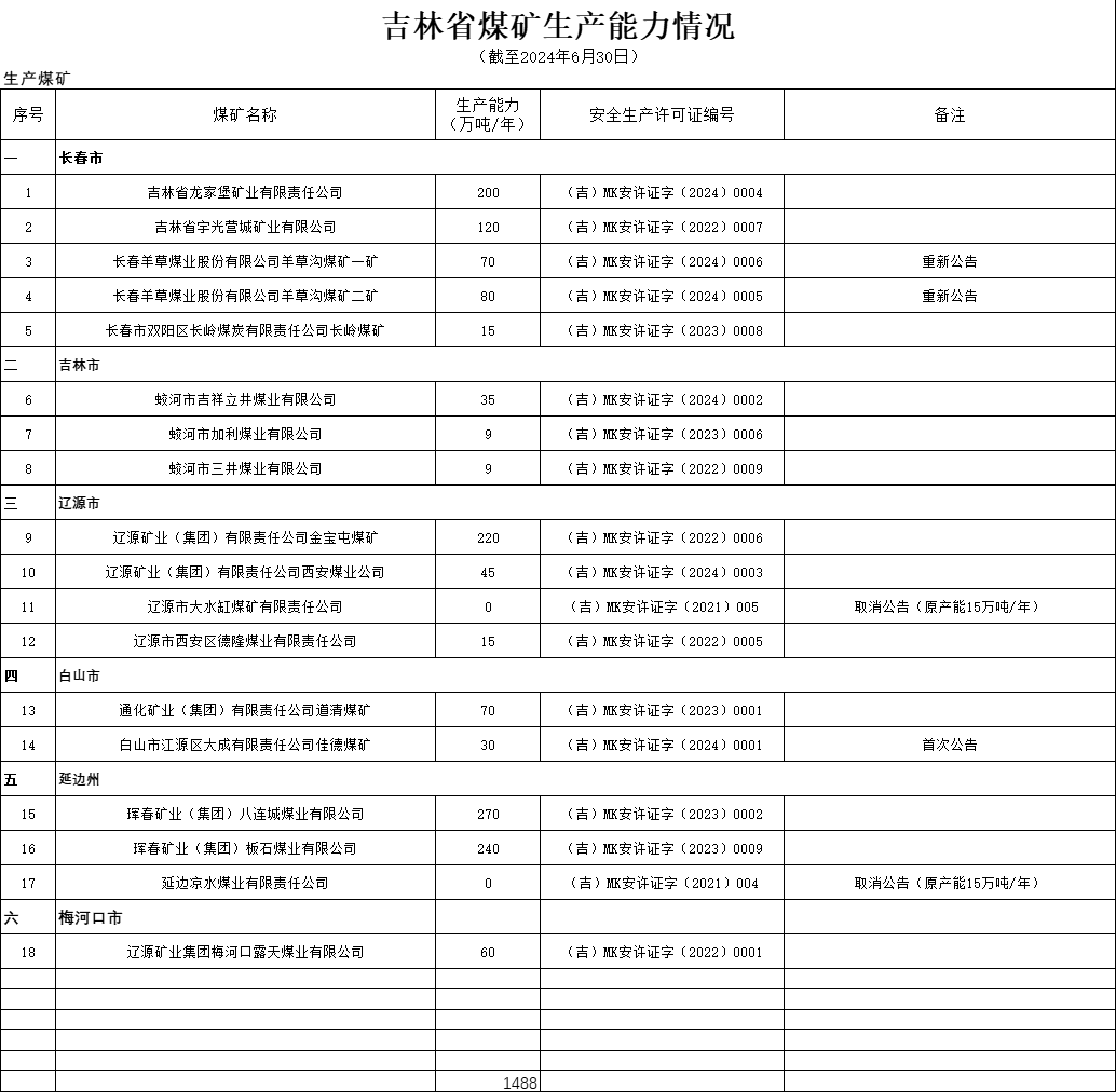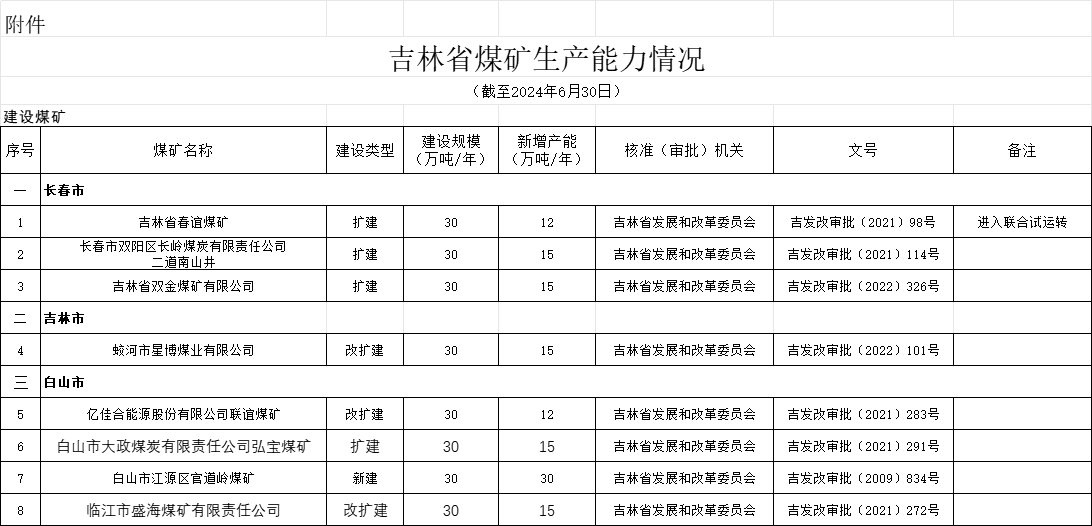 按照《国家能源局综合司关于完善煤矿产能登记公告制度开展建设煤矿产能公告工作的通知》(国能发煤炭〔2017〕17号)要求,现将截至2024年6月30日煤矿建设项目开工信息已经报备且采矿许可证和营业执照齐全的合法建设煤矿,采矿许可证、安全生产许可证、营业执照齐全的合法生产煤矿的产能情况予以通告。 对不符合煤炭产业政策的建设煤矿,产能不予通告。 本次通告建设煤矿8处(涉及产能240万吨/年),生产煤矿18处(其中,首次通告1处,涉及产能30万吨/年;重新通告2处,涉及产能150万吨/年;取消通告2处,涉及产能30万吨/年;继续保留通告13处,涉及产能1308万吨)。 生产煤矿应在矿区显著位置公示煤矿生产能力和年度、月度生产计划,不得超能力生产。煤矿生产能力发生变化经审查确认后,市(州)、县(市、区)煤炭行业管理部门应及时变更登记。 吉林省能源局 2024年9月6日