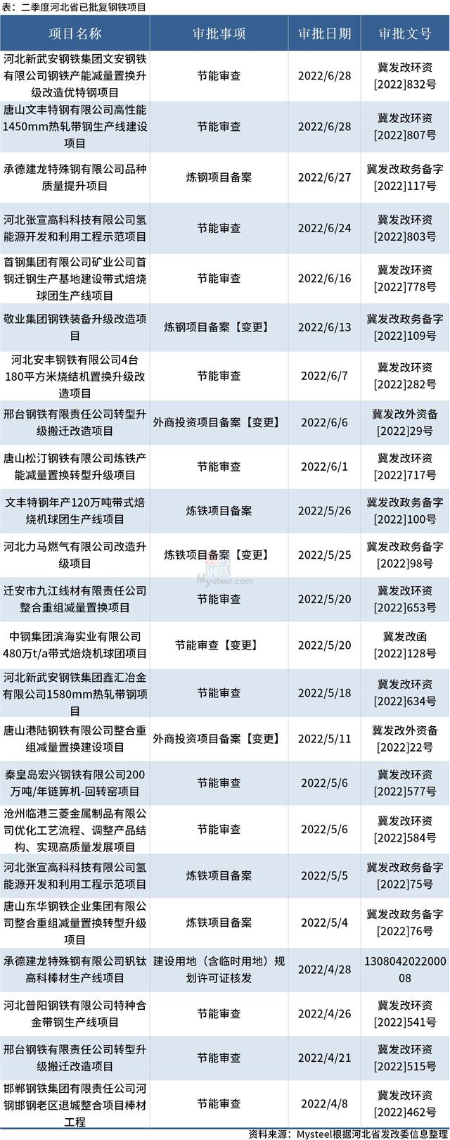 据Mysteel不完全统计,2022年第二季度河北省共批复钢铁相关项目23个。其中,有14个节能审查【变更】,6个炼钢项目备案【变更】,2个外商投资项目备案【变更】和1个建设用地(含临时用地)规划许可证核发。