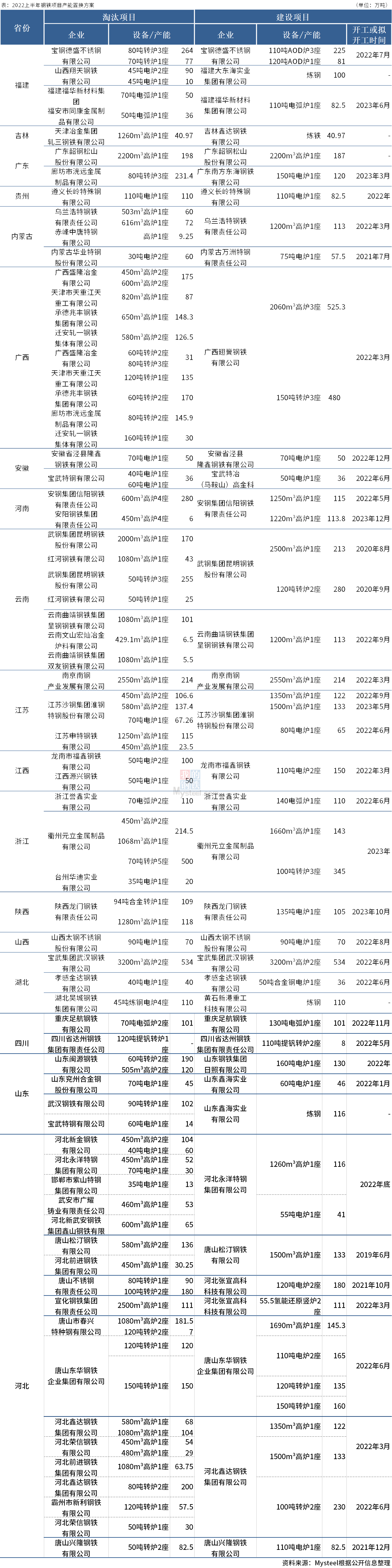 据Mysteel不完全统计,2022年上半年,国内18个省份37家钢厂发布钢铁产能置换方案。其中,涉及新建炼钢产能4091万吨,新建炼铁产能3216.07万吨;涉及淘汰炼钢产能4577.79万吨,淘汰炼铁产能4163.6万吨。