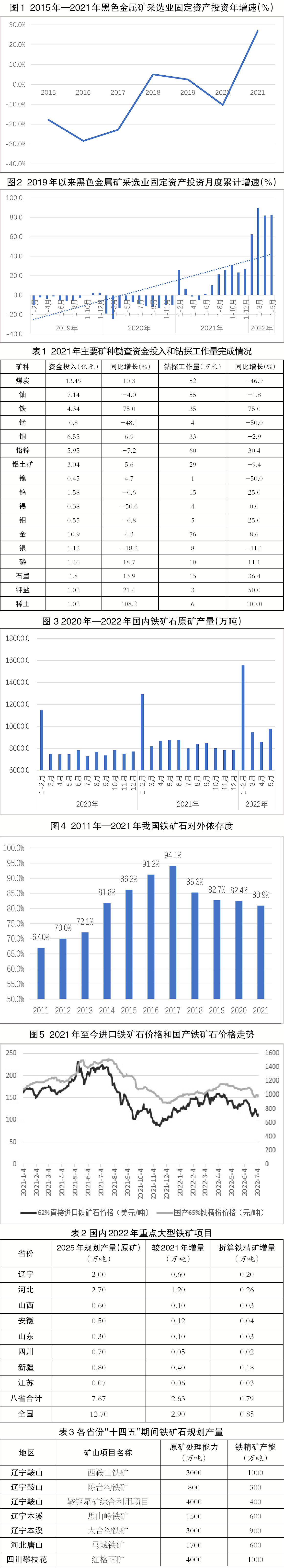 除此之外,今年初国家发改委等十二部门印发的《促进工业经济平稳增长的若干政策》强调,2022年要重点做好铁矿石等重要原材料和初级产品保供稳价,进一步强化大宗商品期现货市场监管,加强大宗商品价格监测预警;支持企业投资开发铁矿等国内具备资源条件、符合生态环境保护要求的矿产开发项目。4月份,国家钢铁煤炭行业化解过剩产能和脱困发展工作部际联席会议办公室印发了《关于加快推进国内铁矿项目建设的通知》(发改办产业〔2022〕255号),要求下大力气实施“基石计划”,推动国内铁矿石项目开发。政策支持力度持续加大。
