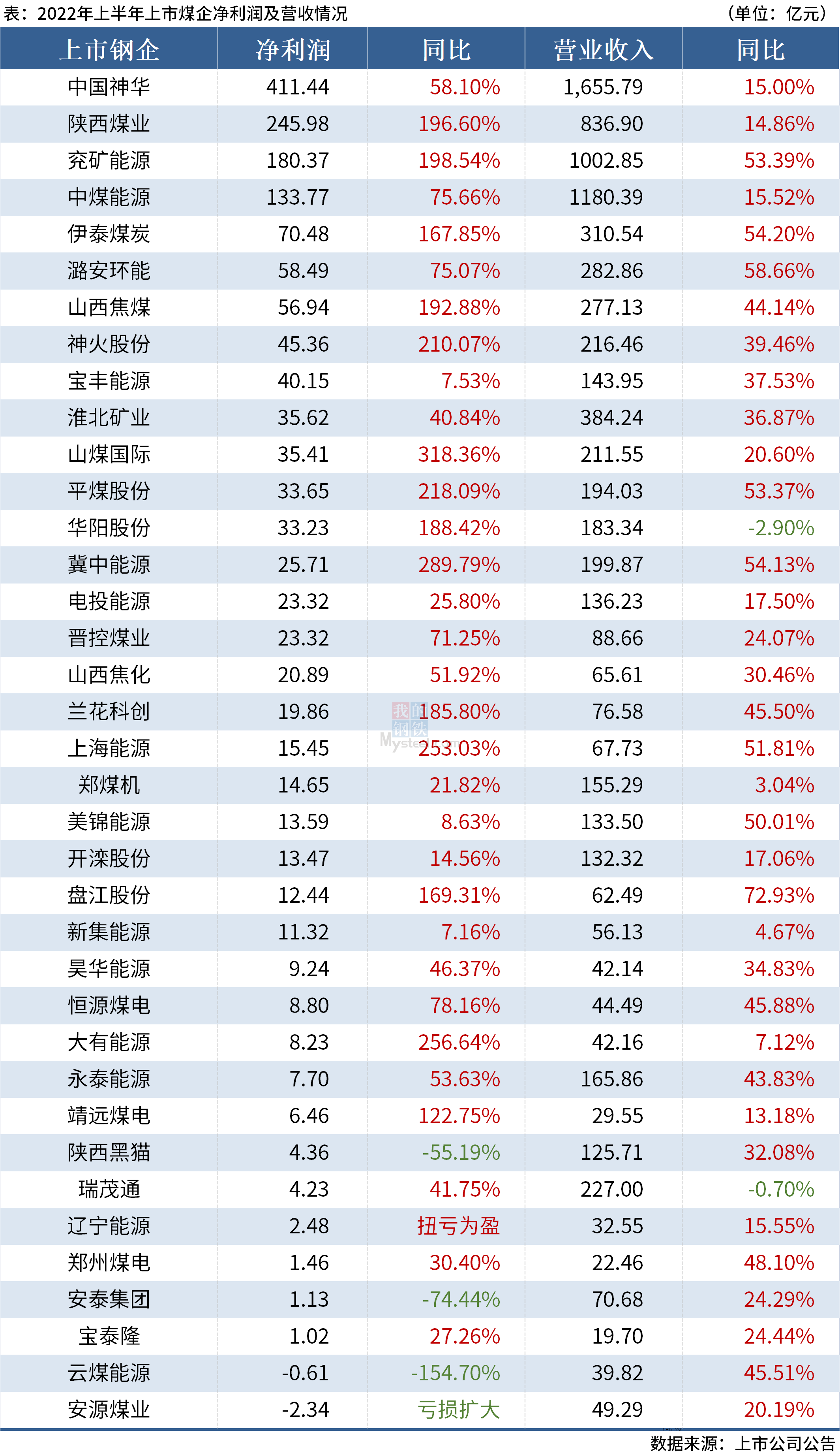 据Mysteel统计,37家上市煤企上半年实现净利润1627.07亿元,35家盈利,2家亏损。其中,中国神华实现净利411.44亿元排第一,陕西煤业和兖矿能源分别以245.98亿元和180.37亿元排第二和第三。