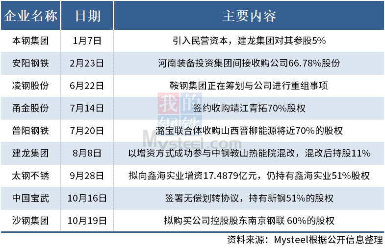 Mysteel:2022年以来9家钢企公布兼并重组情况