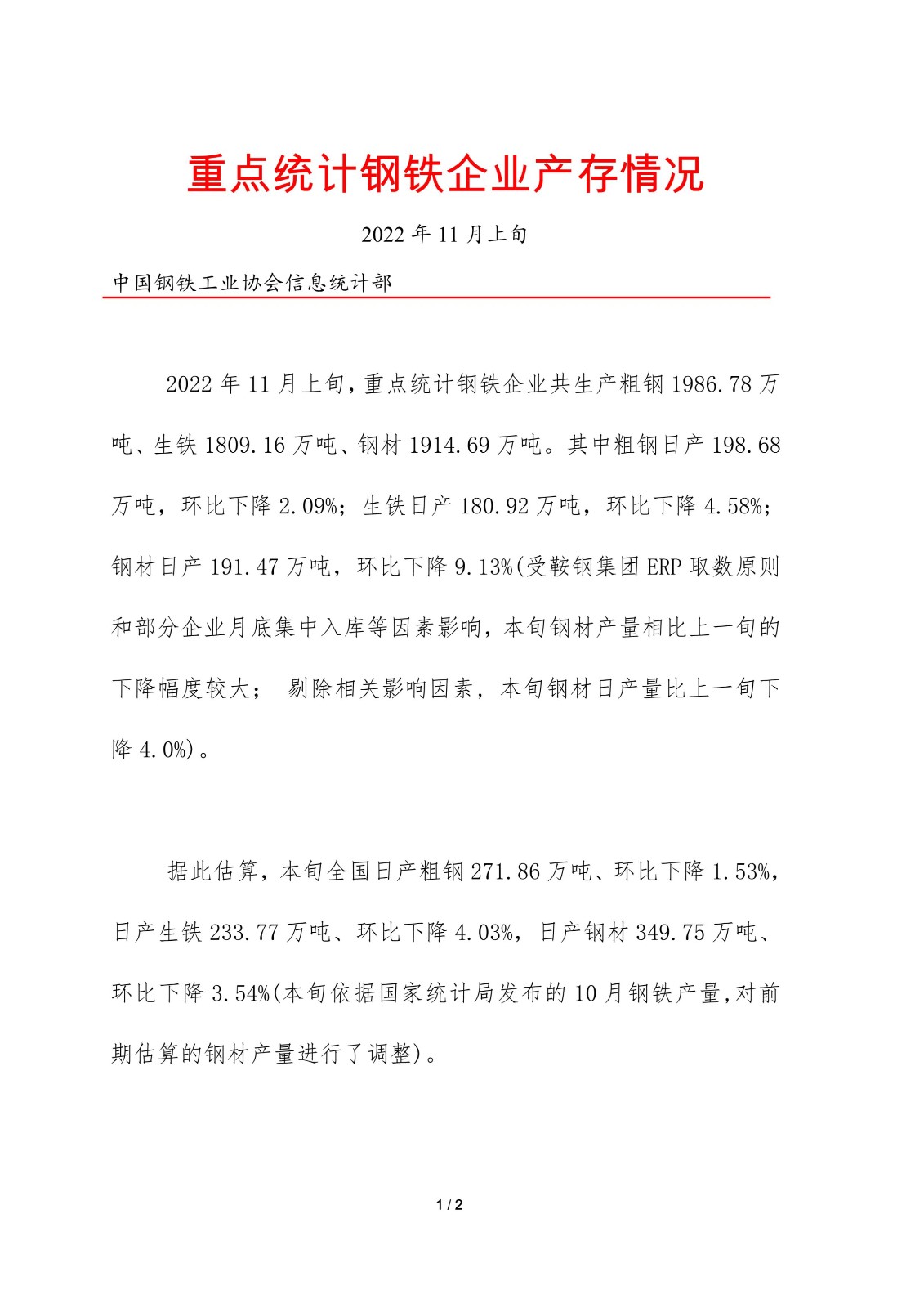 中钢协:11月上旬重点钢企日产粗钢198.68万吨,环比降2.09%