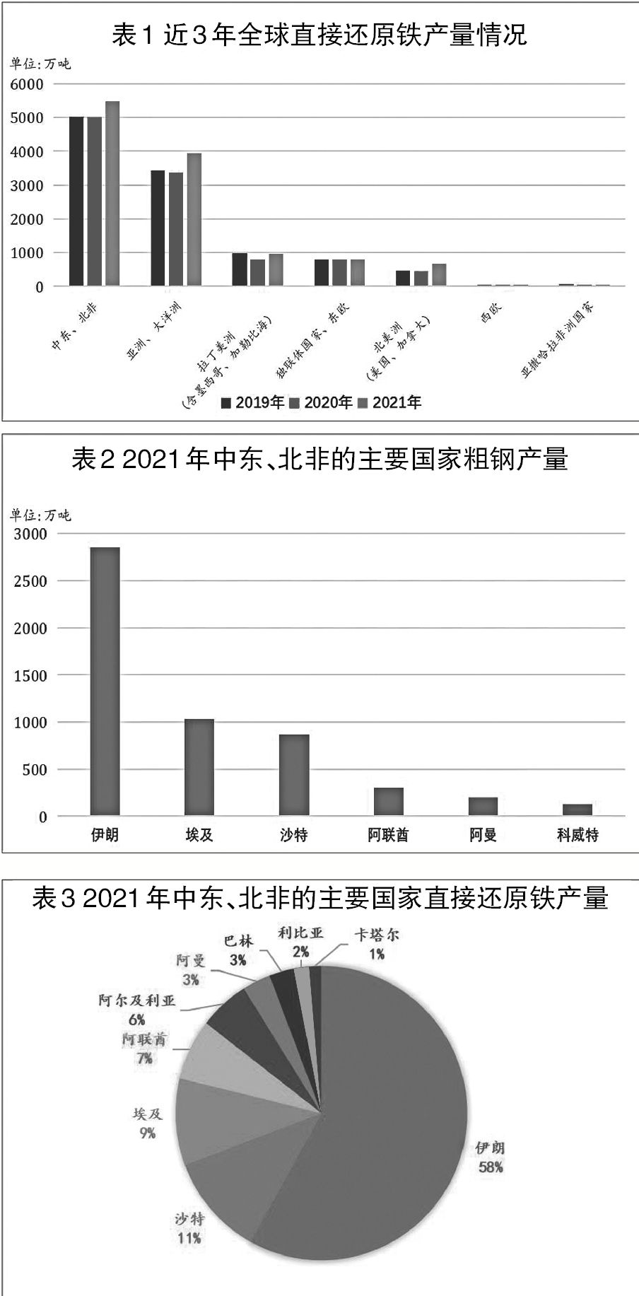 中东的粗钢产量占全球粗钢产量的比例还不到3%。根据世界钢铁协会的统计数据,中东(含伊朗、卡塔尔、沙特阿拉伯和阿拉伯联合酋长国)2021年粗钢产量为4120万吨,同比增长了1.2%。如果把土耳其、埃及、阿曼等国家也考虑进去,粗钢产量则几近1亿吨,但中东、北非的粗钢总体产量仍不及中国的一个产钢大省的水平。