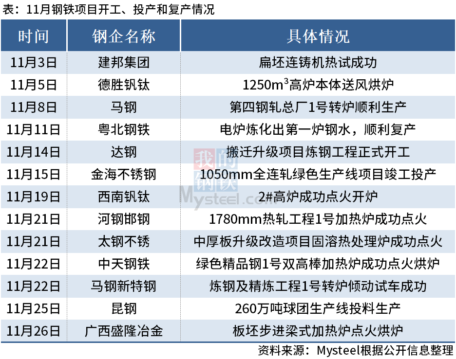 据Mysteel不完全整理,2022年11月国内有13个钢铁项目开工、投产或复产。其中,达钢搬迁升级项目炼钢工程正式开工;金海不锈钢1050mm全连轧绿色生产线项目竣工投产;粤北钢铁电炉炼化出第一炉钢水,顺利复产,具体内容如下。