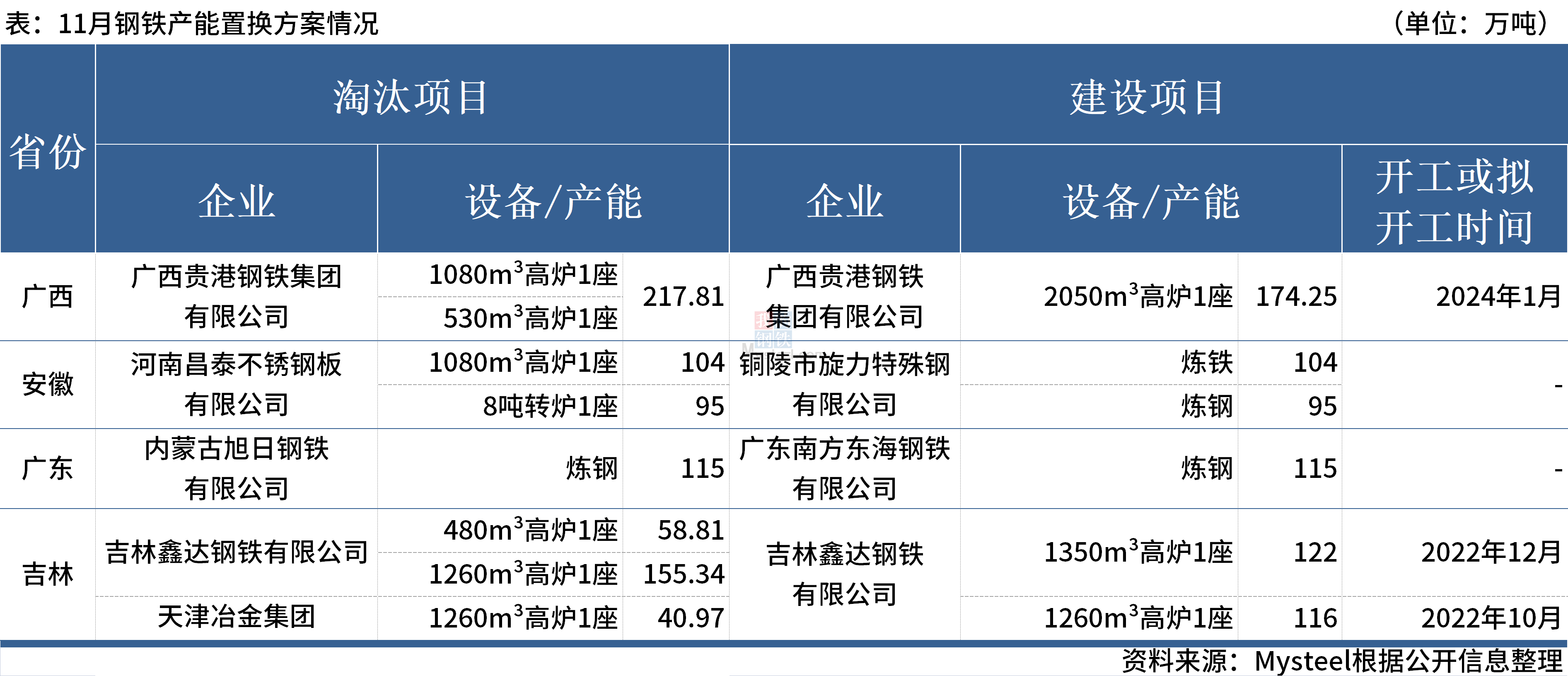 据Mysteel不完全统计,截至2022年11月,国内有4家钢厂发布钢铁产能置换方案。其中,涉及新建炼钢产能210万吨,新建炼铁产能516.25万吨;涉及淘汰炼钢产能210万吨,淘汰炼铁产能576.93万吨。