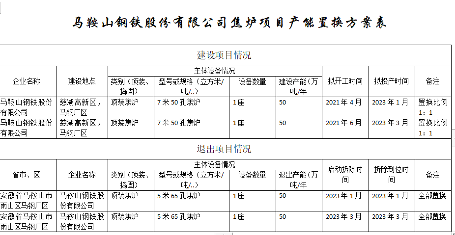 根据置换方案,将原2座65孔5米焦炉产能等量置换为2座50孔7米焦炉,新焦炉产能应为100万吨/年,置换方案于2020年11月20日公示。专家听取了马钢对《马钢焦炉产能置换方案》介绍及说明,对焦炉进行现场查验,对焦炉图纸进行校对,最后核定:马钢焦炉大修项目中的9#10#焦建设符合产能置换方案,其产能为100万吨/年。