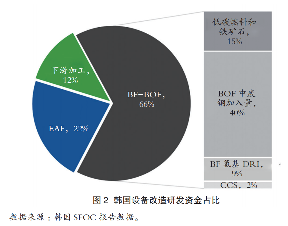图1展示了韩国政府用于设备改造和设备转换的研发资金投入。图2所示的BF-BOF改造技术(占设施改造资金总额的66%)保持了焦炭(煤)作为主要生产原燃料使用,其中焦炭是碳排放的主要来源。