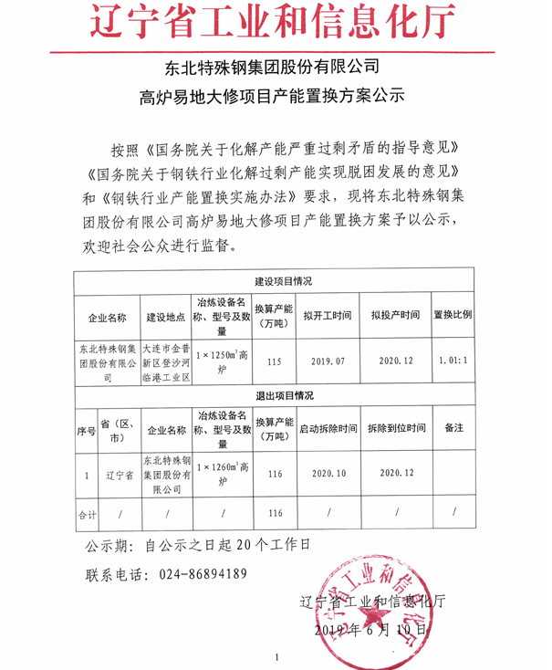 东北特殊钢集团高炉易地大修项目产能置换方案公示