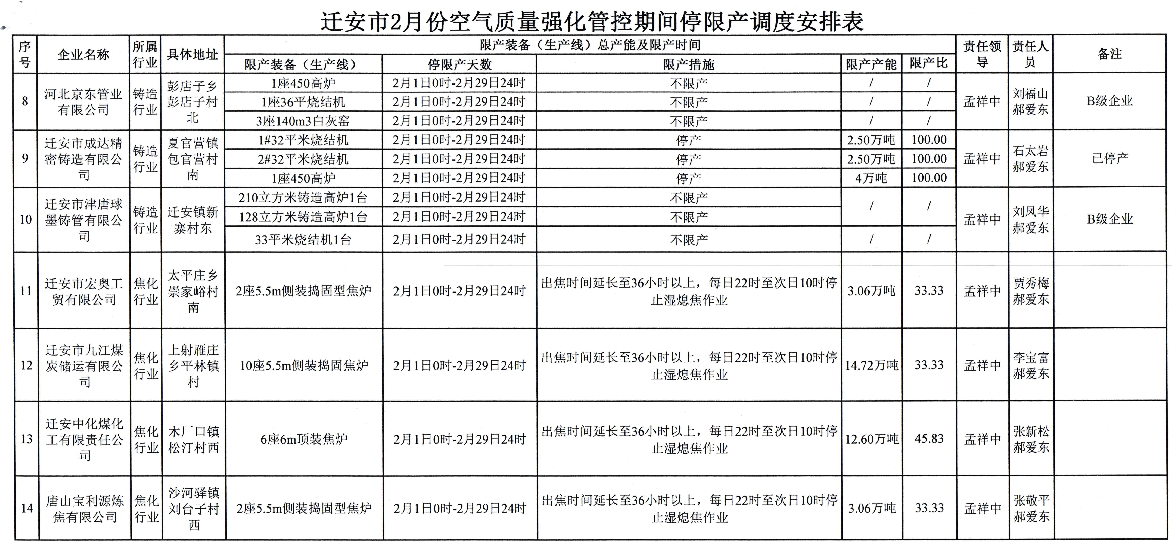 迁安市2月份空气质量强化管控期间停限产调度安排表