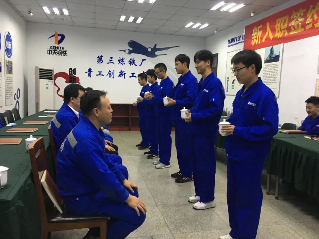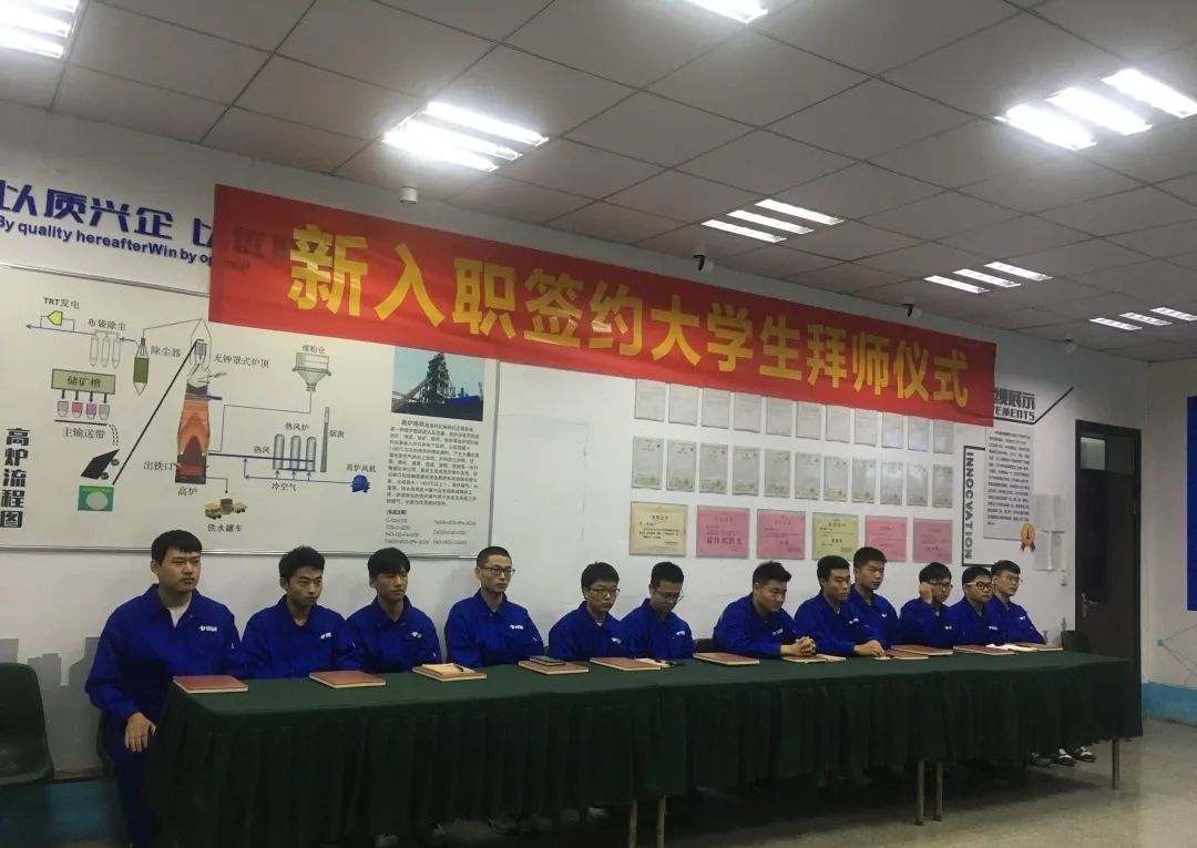 9月9日下午14:00,第三炼铁厂在厂部一楼实训基地举办一场2020届签约大学生拜师仪式。三炼铁副厂长孔亚东、设备副厂长杨杰、厂长助理张慧杰、炼铁第一党支部专职副书记陈慧、二级主管韩建峰、二级技术助理刘喜华、二级技术助理李迪、一级技师芮月新、7#炉炉长毛东辉、5#炉副炉长周云锋及12名新进大学生参加此次活动。