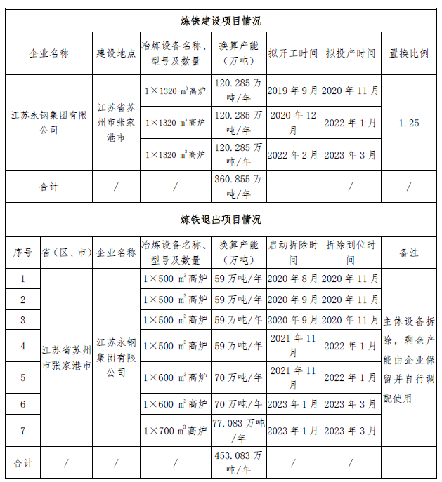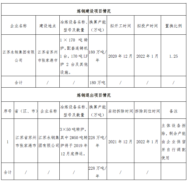 关于江苏永钢集团有限公司钢铁产能置换方案的公示 时间:2019-10-15 07:04 来源:未知 作者:zhengjb 点击:次 按照《国务院关于化解产能严重过剩矛盾的指导意见》、《国务院关于钢铁行业化解过剩产能实现脱困发展的意见》和《钢铁行业产能置换实施办法》要求,现将江苏永钢集团有限公司钢铁产能置换方案予以公示,欢迎社会公众进行监督。公示期为2019年10月14日至2019年10月20日。如有异议,请以书面形式向江苏省工业和信息化厅反映情况。联系电话:025-83398236(业务咨询)、025-69652843(驻厅纪检监察组)。江苏省工业和信息化厅2019年10月14日 (责任编辑:zgltw) 上一篇:河钢邯钢公司中板产品成材率效益双提升 下一篇:河钢承钢线材事业部品种钢恒拉速浇铸攻关取得新进展