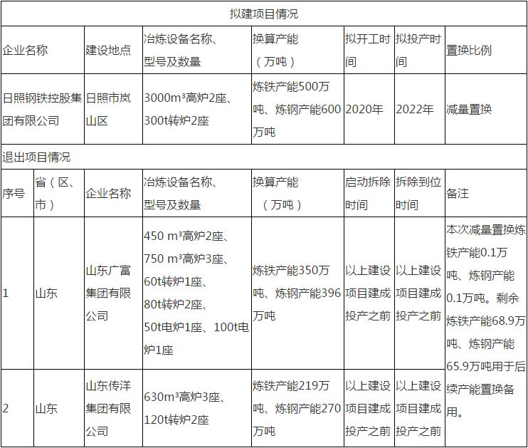 11月13日,山东省工业和信息化厅网站对日照钢铁控股集团有限公司产能置换方案予以公示。 公示内容显示,日照钢铁将建设3000立方米高炉2座,300吨转炉2座,涉及炼铁产能500万吨、炼钢产能600万吨,该项目拟于2020年开工,预计在2022年投产。