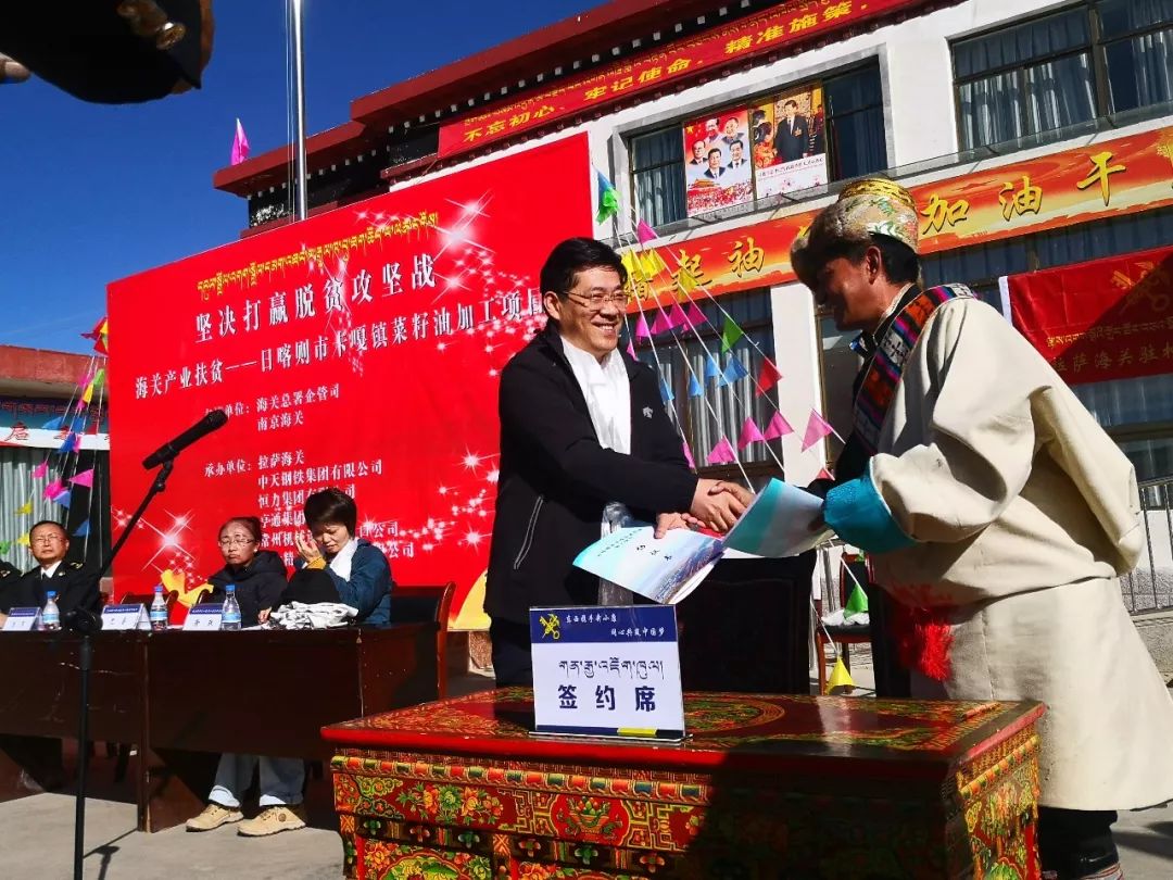 近日,西藏日喀则市卡嘎镇秋高气爽、阳光明媚,来自该镇的查仓村、夏角村等农牧民群众身着节日盛装,欢聚在查仓村党群活动中心,满怀期待着“日喀则市卡嘎镇菜籽油加工项目”签约和奠基仪式的隆重举行,海关总署、南京海关、拉萨海关等领导,中天钢铁集团领导李军出席仪式。